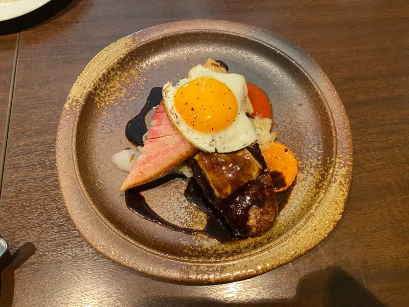 デミグラスソースのハンバーグにチーズ、ベーコン、目玉焼きがトッピングされた贅沢なメニューです!