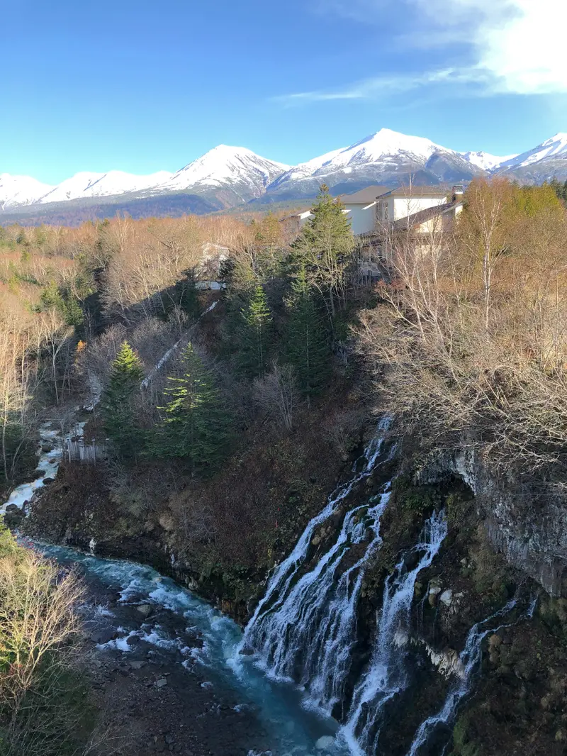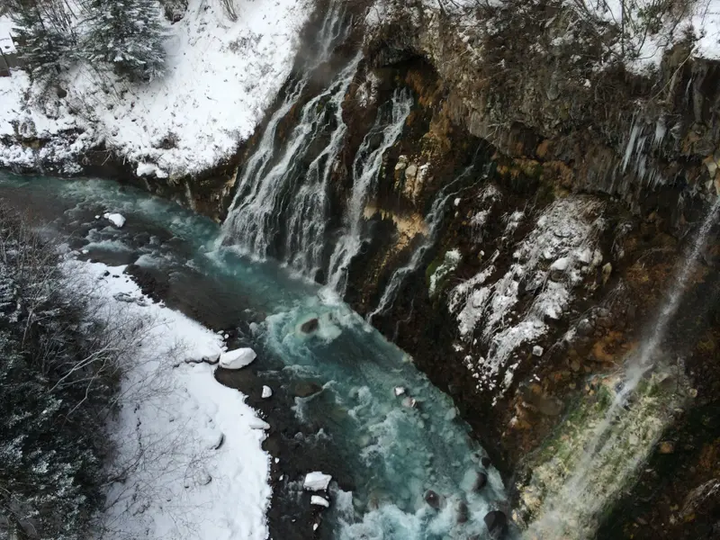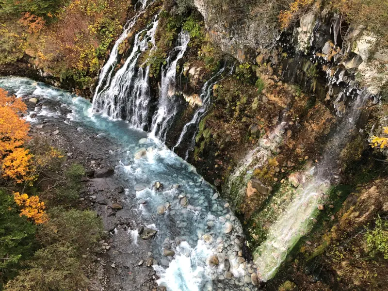 次にご紹介するのは、「青い池」から少し離れた白金温泉にある「白ひげの滝」です。滝が流れ込む川は、「青い池」と同じく水の色が青く、通称「ブルーリバー」と呼ばれています。こちらも素晴らしい青です。
