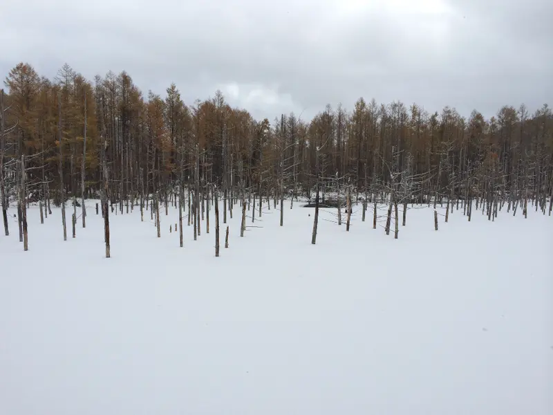 この時期しか見られない、いつもの「青い池」とは違ったレアな光景です。