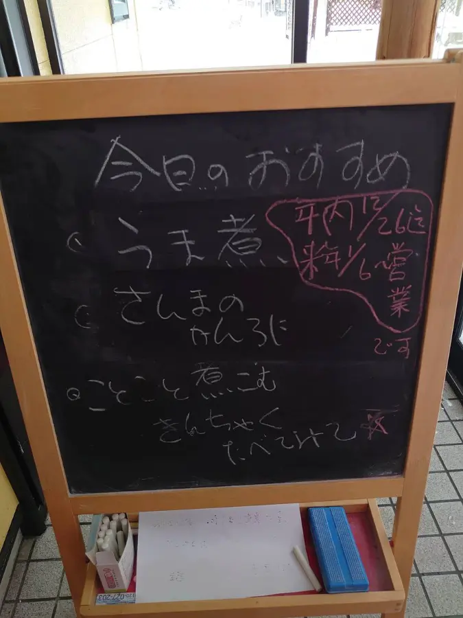 玄関先には、黒板が置いてあり、その日のお惣菜が書かれていました。