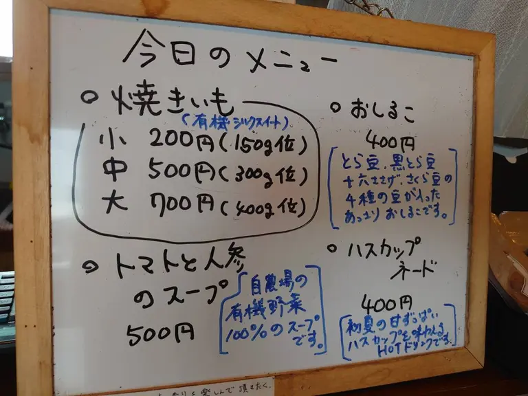 おしるこ(400円)と、焼きいも(有機シルクスイート)の小(150g位)200円をいただきました。