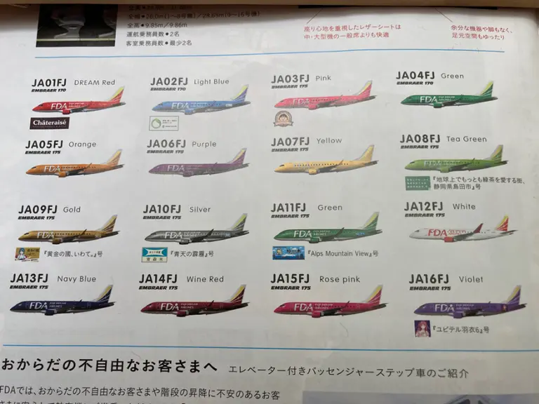 どの機体に乗れるかもFDAに乗る楽しみの一つです。(詳しくは、機内誌を写した画像をご覧ください。)