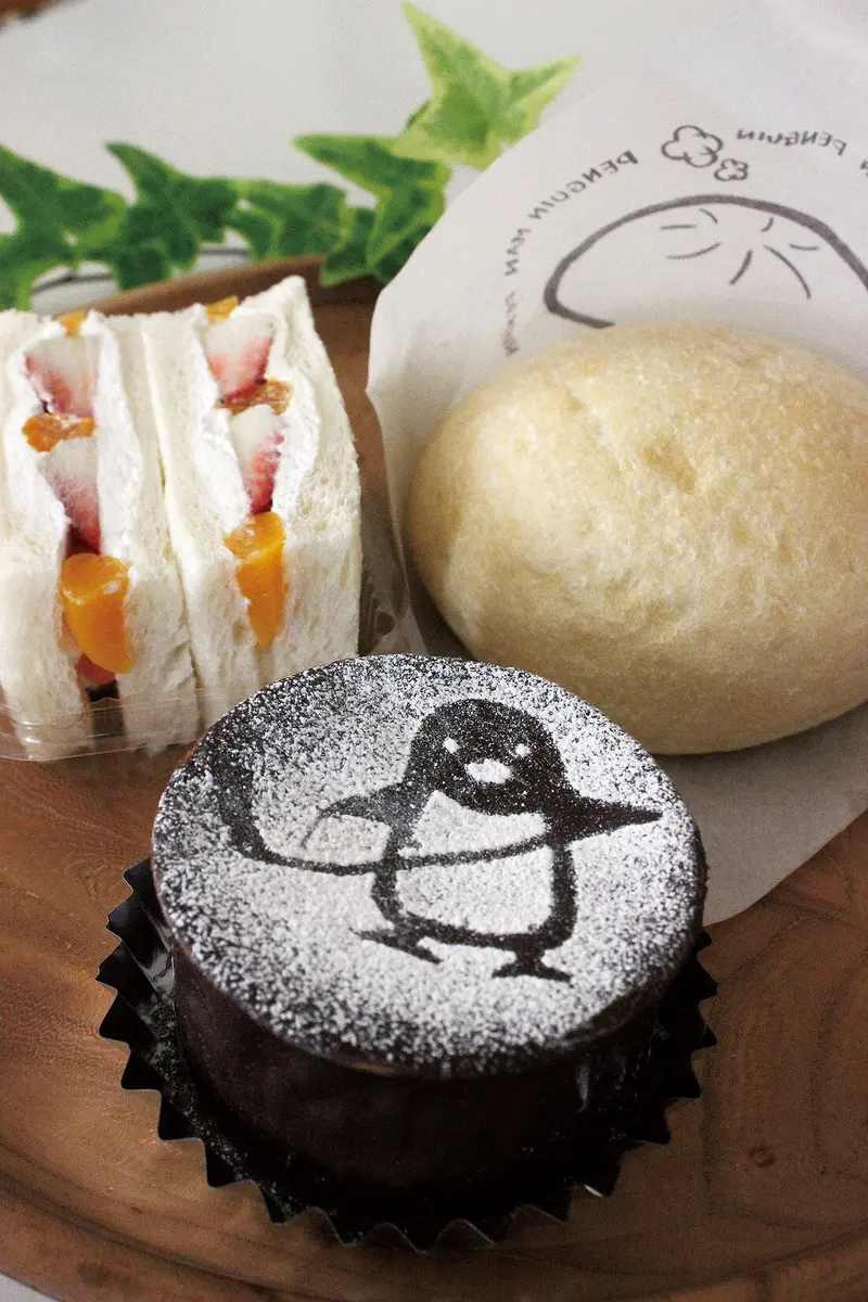 アイスホッケーのパックをイメージした苫小牧店オリジナルの「パックパン」は、2020年1 月登場以来大人気に。中にホワイトチョコクリームが入り、表面をチョコレートコーティングした。粉砂糖で描かれた、店名にちなんだペンギンのキャラクターがかわいい。