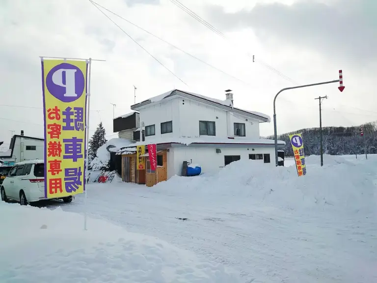 冬はちょっと分かりにくいですが、旭川から向かうと、左手にあるバジェットレンタカーの向かい側。ノボリが目立つので分かる思います。