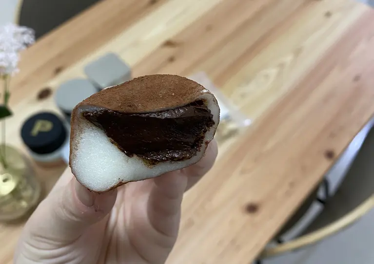 実はこちらの方が販売期間が短い生チョコ大福。1月から2月バレンタインデー頃迄なんです。あんこと生チョコの境目が分かりづらいですが、めちゃくちゃでかい生チョコが入っています!なめらかで濃厚な生チョコが餡とお餅と大変良く合う。これ私大好きでした。