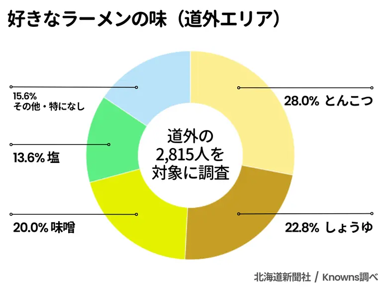 道外3位の味噌(20.0%)、同4位の塩(13.6%)は、それぞれ道民人気1位、2位のツートップ。見方を変えれば、味噌と塩のおいしいラーメン店は道内に多いのかもしれません。
