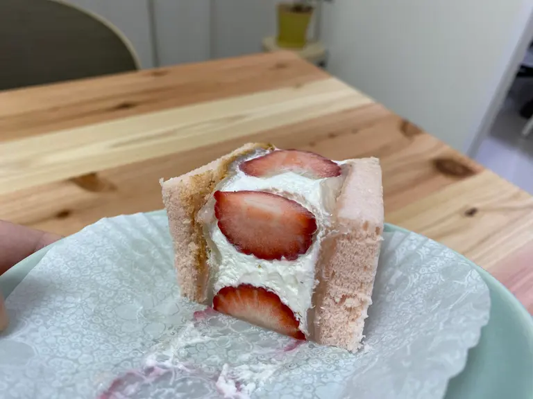 フルーツサンド一つで600円弱は正直高いなーって思いましたが、箱から出してみるとめっちゃでかいしずっしりしているし、苺もたっぷりと入っていたので納得しました。笑