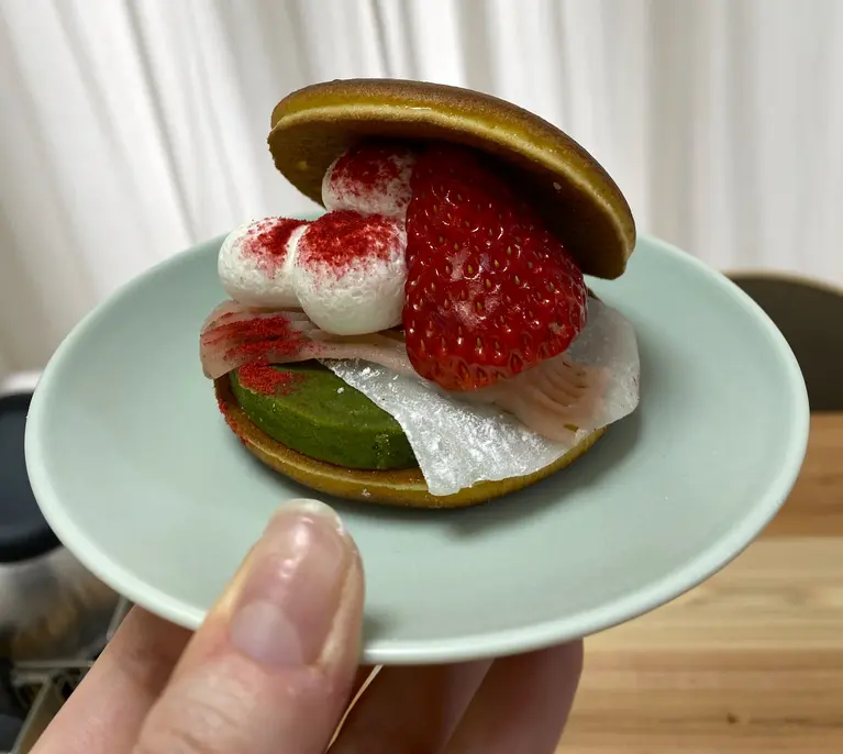 こちらのお店にある桜スイーツは「苺と桜抹茶餡大福生どら」(480円)です!
