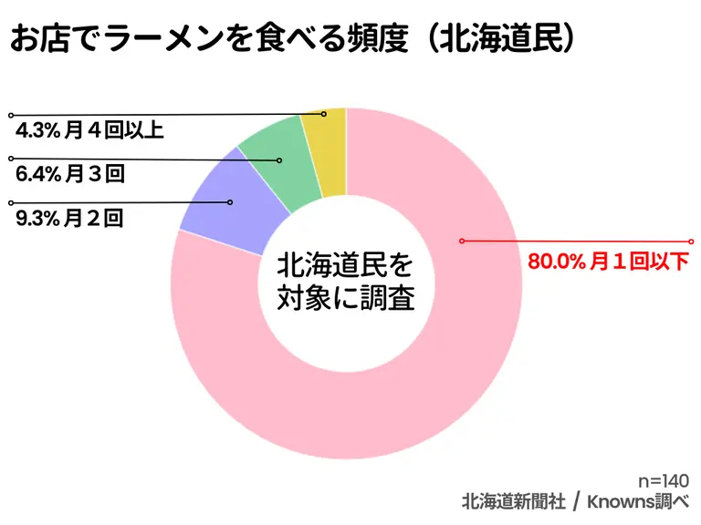 平均して週1回はラーメン店へ足を運ぶ「月4回以上」と答えた道民は4.3%(道外は7.8%)。