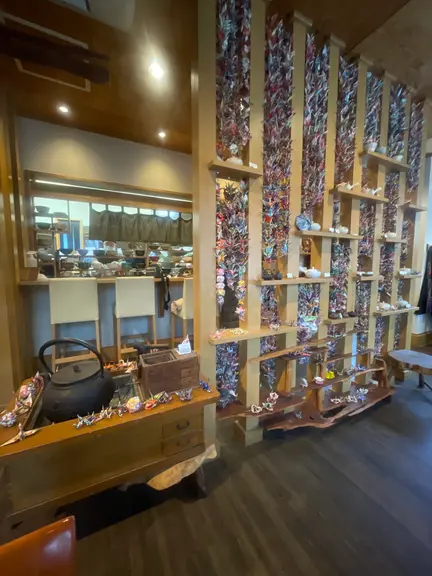 茶器が置いてあるだけでなく、色とりどりの折り紙で折った鶴や風船がたくさん!