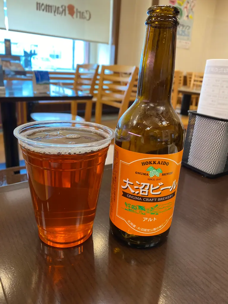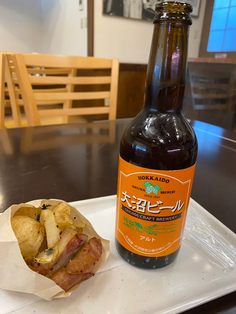 ジャーマンポテトは、ベーコンとソーセージの両方が入っていてまさに一度で二度おいしい。お供にチョイスした大沼アルトビールは濃いキャラメル色で甘さと苦みのバランスが最高です。