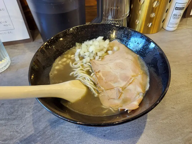 細麺の上に大きなチャーシュー、刻み玉ねぎ。