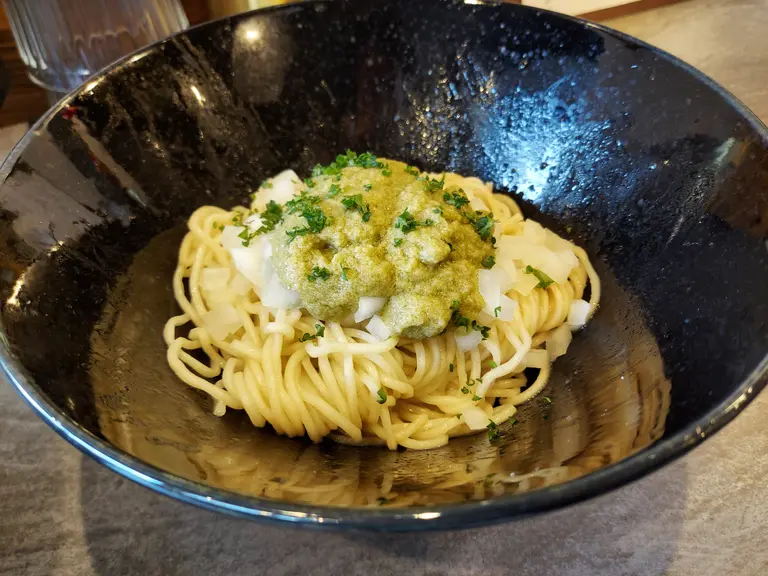 替え玉のような麺の上にアサリガーリックバターのペーストがドンッ!