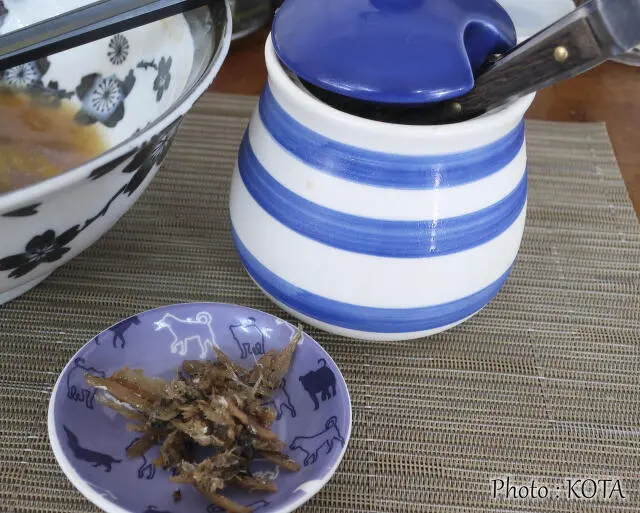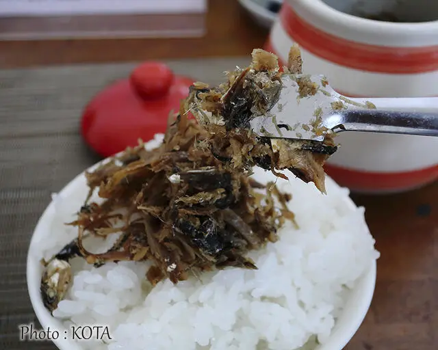 出汁を取るために使った煮干しを調理し、こうして客にふるまっているようだ。