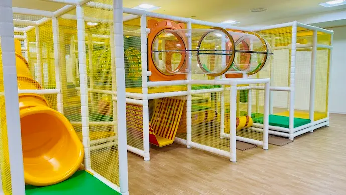 空中透明トンネル、滑り台、トランポリン、パンチングポールなどみんなで楽しめる遊具です。