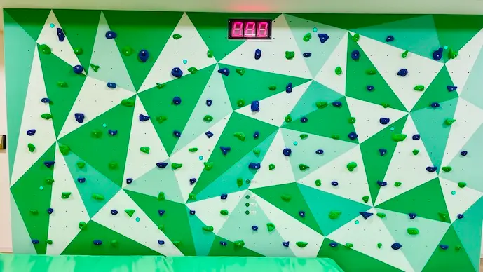 中央上部に空いた部分にはタイマーが設置されています。壁面に数箇所光る押しボタンがあり、スタートボタンを押すとタイマーがスタートして、ボタンが点灯します。全部のボタンを押すとタイマーがストップする一味違ったボルダリングです。