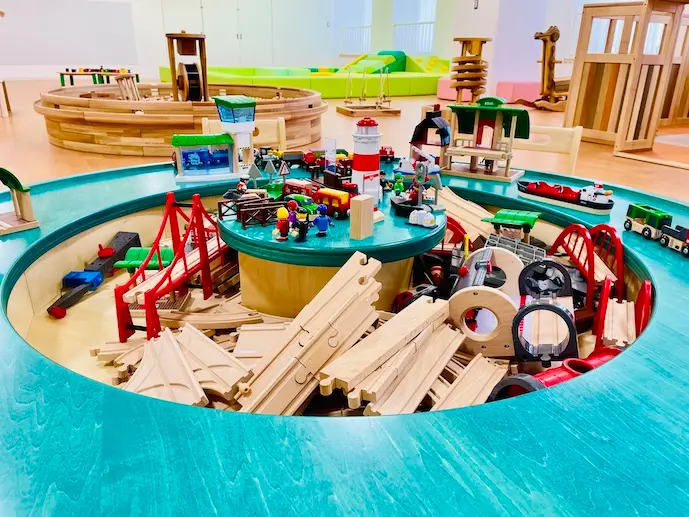 スウェーデン生まれの木製玩具メーカーBRIO(ブリオ)のレールセットがたくさんそろったテーブルです。長〜い線路が作れます。