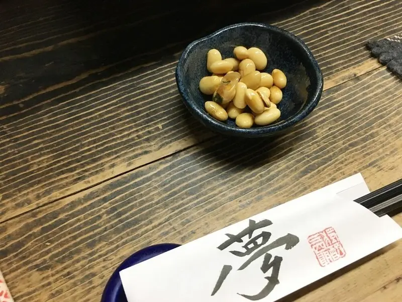 お通しの「酢大豆」は、創業者である初代店主が考えた1品。ふっくらとした大豆に酢のさわやかな酸味、風味付けの大葉の香りが効いてお酒にぴったり。