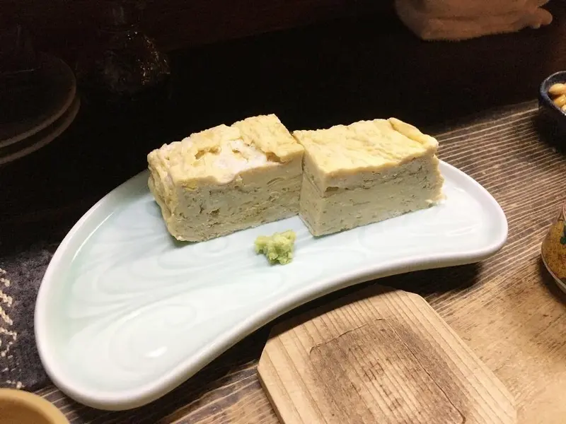 そして、厚く焼かれた玉子焼き。甘い玉子焼きも好きだけど、日本酒には、わさび醤油で食べる出汁の効いた玉子焼きが相性抜群。これだけで日本酒2合は飲めそう。まあ、つまみが無くても飲みますけどね。