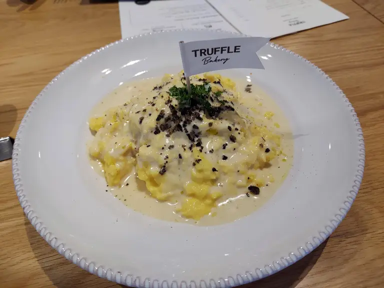 ふわっふわの半熟卵の上に黒トリュフが贅沢に添えられていて見るからに美味しそう。