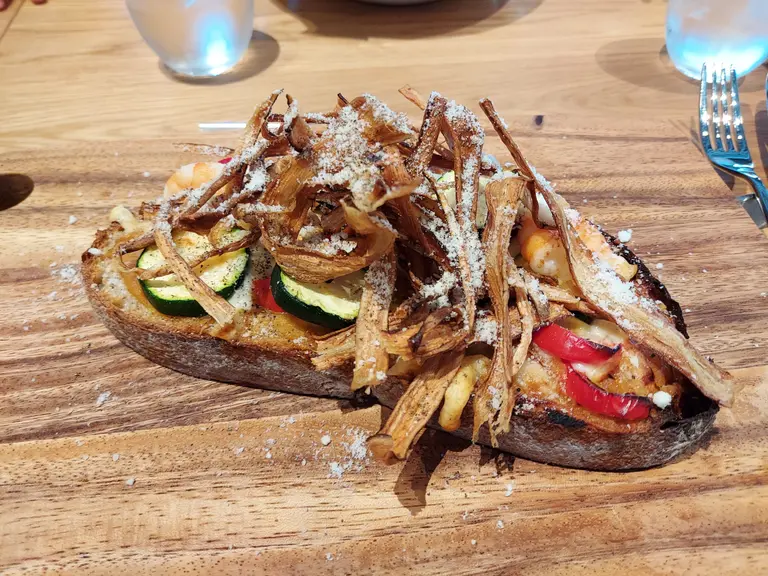 トーストしたバゲットの上に、ごろっとしたエビと野菜が盛り付けられていて、カリッとしたゴボウのフライが添えられています。