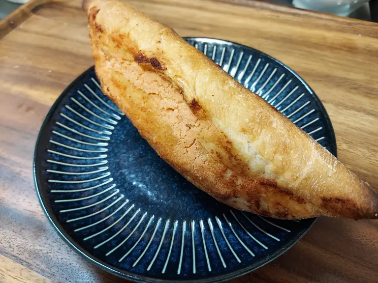 フランスパンのパリっとした表面と明太バターがたっぷりと塗られたもちっとした生地のギャップがたまらないです。トースターで焼いてカリッモチッです。