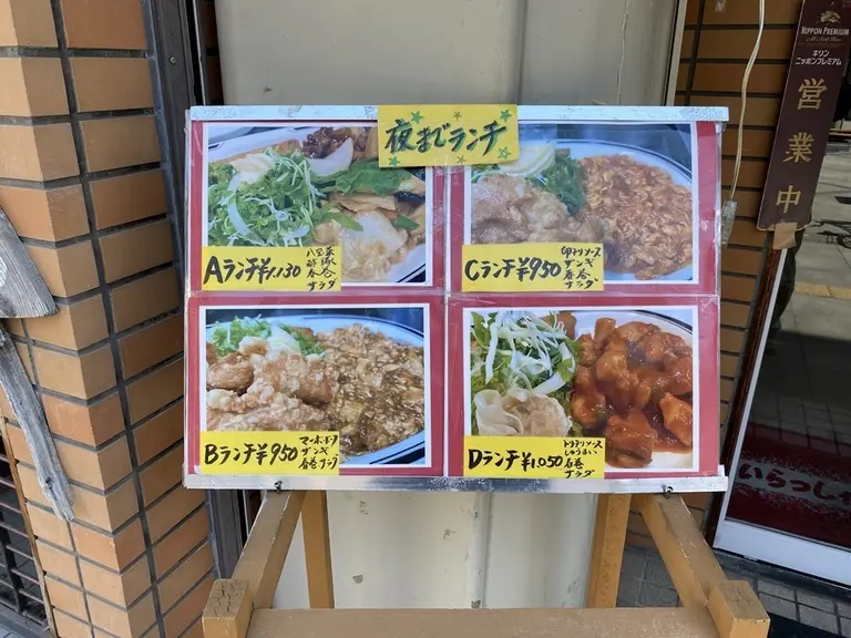入り口の前には、AからDまで4種類のランチメニューが写真付きで紹介されています。「夜までランチ」と書かれているので、ランチタイム以外にも注文できるようです。