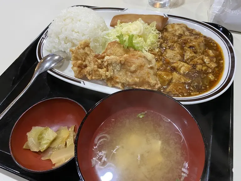 「Bランチ」は、麻婆豆腐にザンギ、春巻きと、誰でも好きそうな中華3品がワンプレートに盛り付けられています。