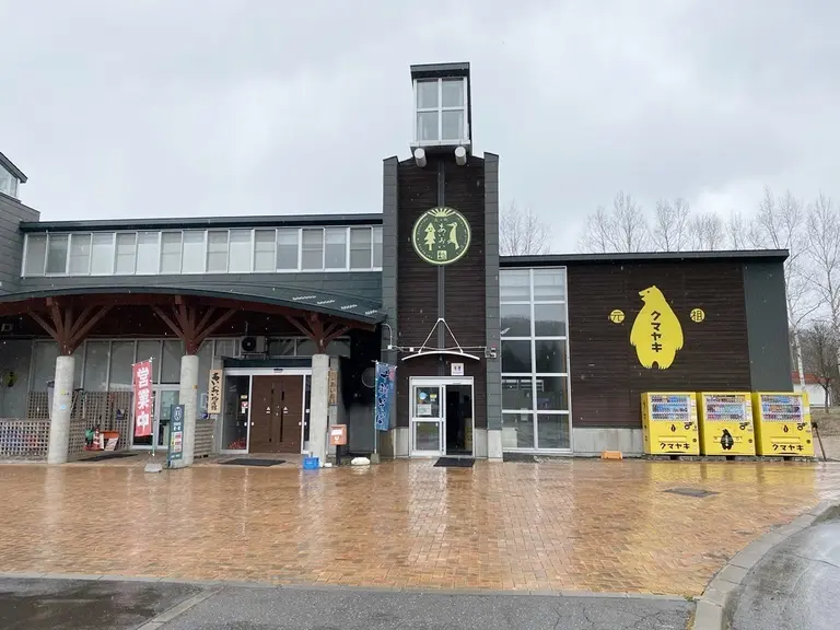 建物の壁にクマヤキと書かれた黄色いデザインと、黄色い自動販売機が目を引きます。