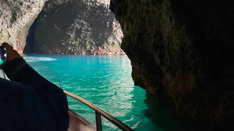 洞窟内に差し込む自然光で、海面が青色に輝いて見えます!