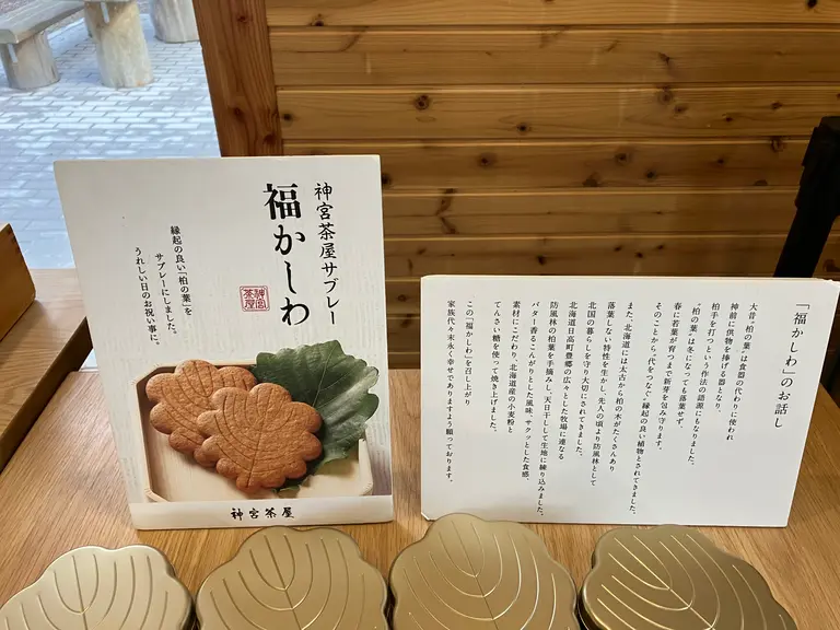 ご紹介した「焼きたて福レ餅」は、2022年12月26日からこちらの店舗限定で販売しておりますが、その以前には上の写真に写っている柏の葉をかたどったサブレーの「福かしわ」(ふくかしわ)の焼きたてを販売していました。