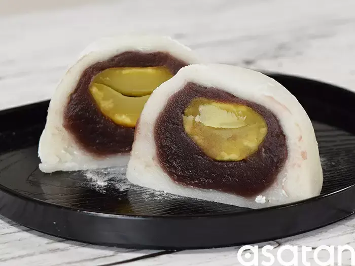 お店の特徴でもあるモチモチ生地の中には滑らかで甘みもしっかりあるこしあんと大きな栗が一つ。
