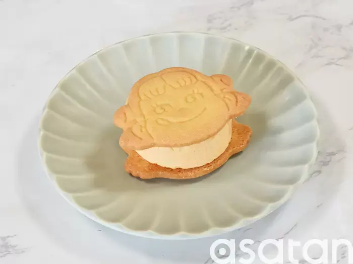 ペコちゃんが描かれたクッキーは柔らかめの食感でクリームとよく馴染みます。