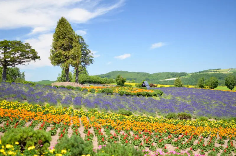 四季彩の丘は美瑛にある人気観光農園。なだらかな丘に鮮やかな色彩の花々が植えられていることで知られます。多くの花々とともにラベンダーも楽しむことが可能。映えスポットとしても有名で、十勝岳連峰と鮮烈な花々の組み合わせはなかなか絵になります。敷地内にはアルパカ牧場もあります。繁忙期中は、入場有料。駐車場も有料です。