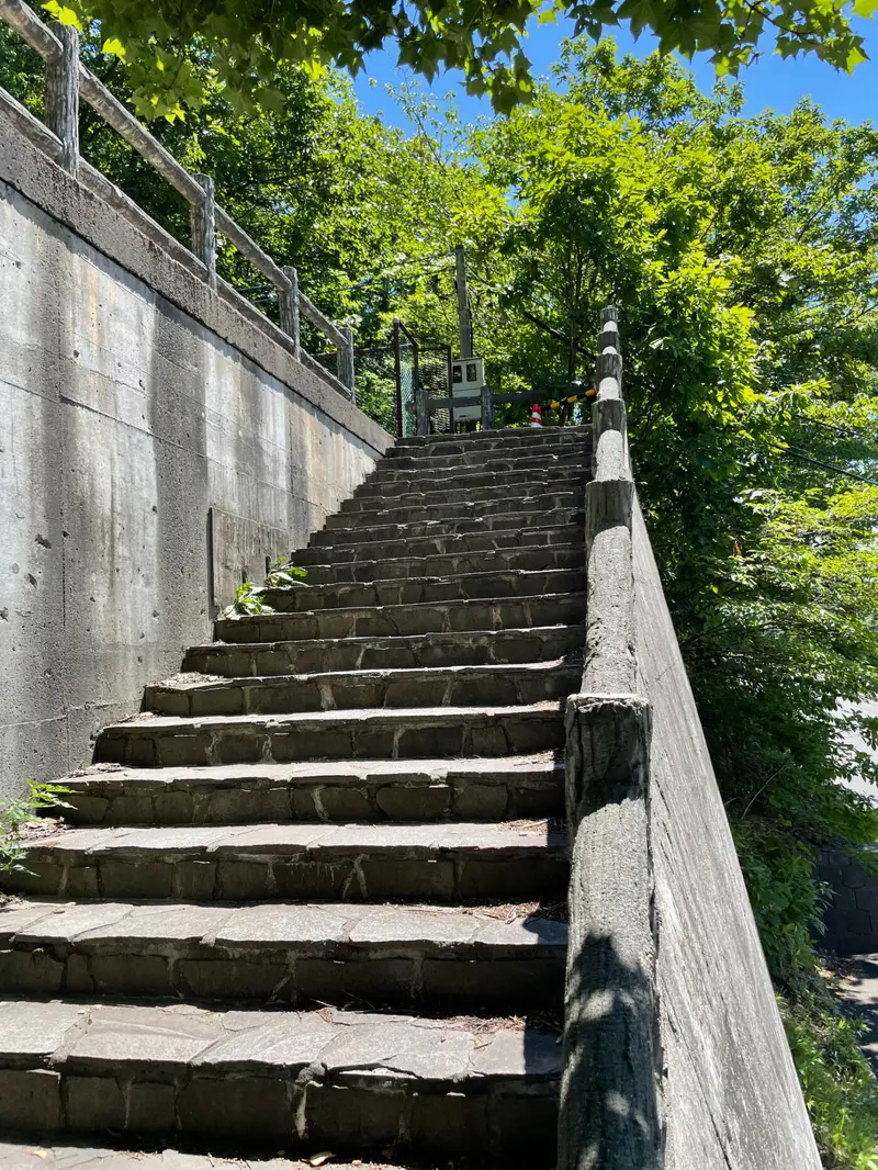 3度目だし場所はわかっているから、どっちへ向かえば良いのかは察しがついている。ただ、いつもは車で通る程度で、公式サイトにあるヒント「大きな階段」なんてあった?!と思いつつ、アクセスにある通り、駅を出て南へ向かうと…あった!!階段!!