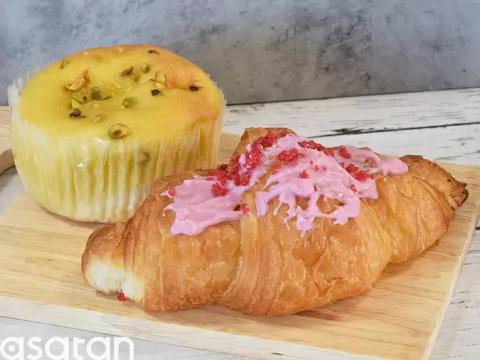 ストロベリークロワッサン(税込270円)は、バターの香りがきいたパン生地に、いちごチョコレートと甘酸っぱいフリーズドライのいちごがアクセントに!