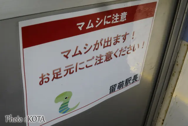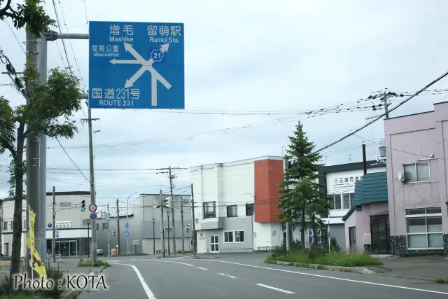 案内標識にはまだ「留萌駅」の文字が。こうした標識は他にも確認できた。駅はないが、駅前の市場や飲食店を目指す観光客には役立っていると思われる。