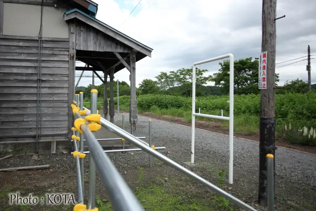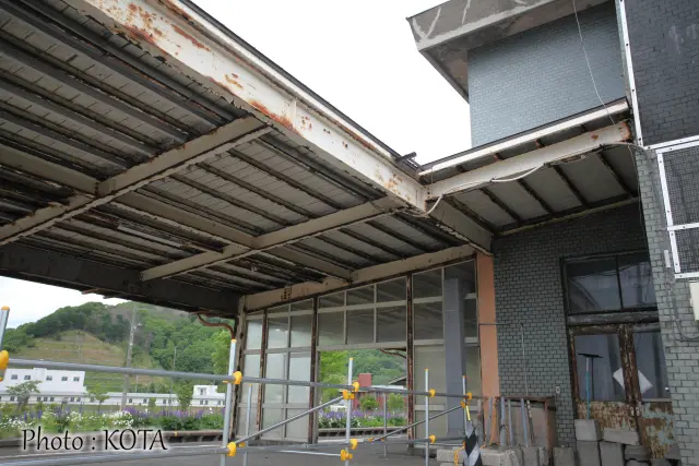 上画像は、前掲の駅舎全景でいうところの向かって右側。バリケードによって侵入することはできない。