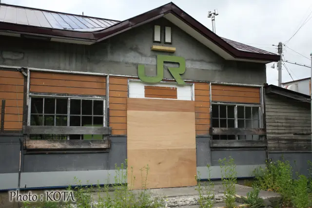 現在はというと、もちろん駅舎は閉鎖。入り口がべニアでふさがれている。