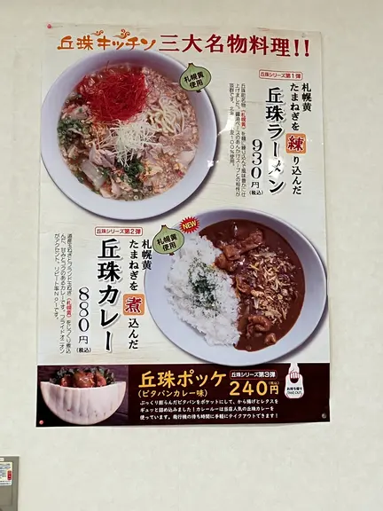その名物料理は、北海道産ブランドたまねぎ「札幌黄」を麺に練り込んだ「丘珠ラーメン」、「札幌黄」と道産玉ねぎを煮込んで作った「丘珠カレー」、札幌丘珠空港ビル開業30周年を記念して販売開始された、ザンギと丘珠空港名物「丘珠カレー」をピタパンにINし、ポケットにみたてた「丘珠ポッケ」です。