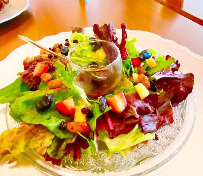 歯ざわりの良いレタスや紫水菜に乗っているのは色とりどりのベリーや果物。これを自分で全部準備するのは大変なので、それだけでもう感激♡♡