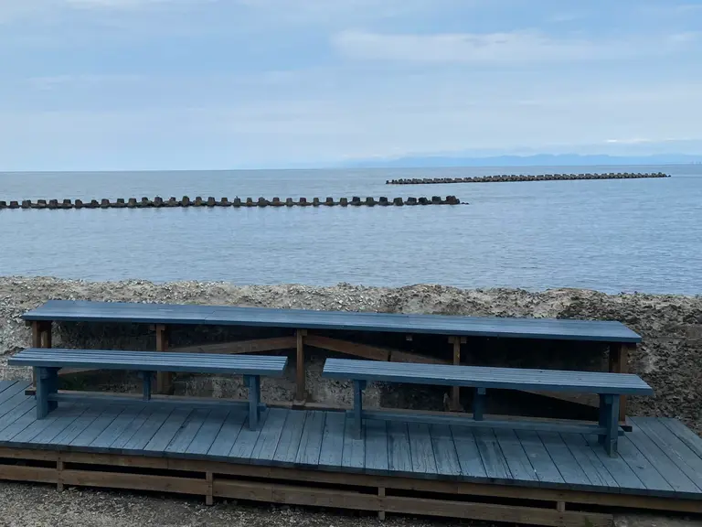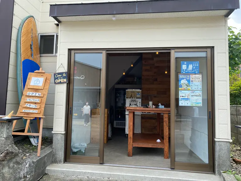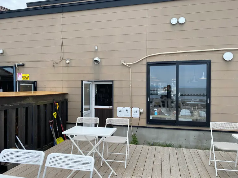 裏はすぐ海。テラス席もあり海を見ながらゆっくりできます。映えスポットです。ただ運悪く、このときはちょうど雨に降られてしましました。(お店を出た後雨はあがりました泣)