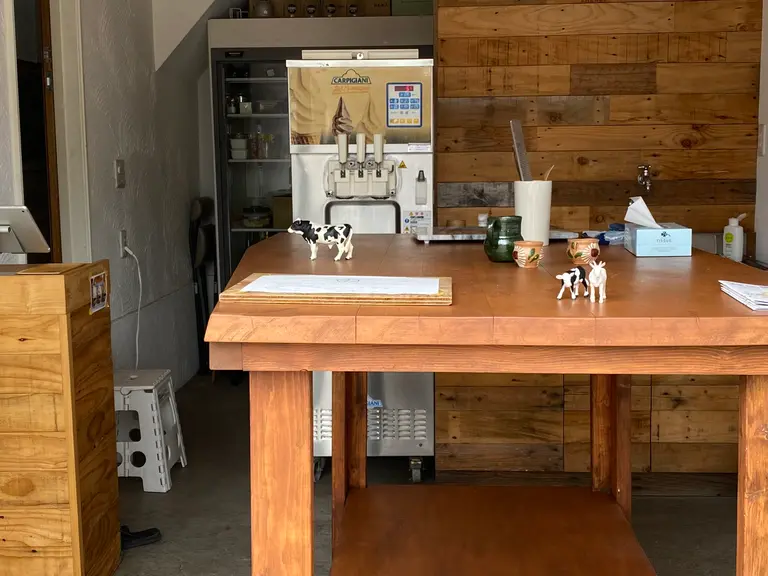 ソフトクリーム屋さんです。営業中のようで開いてはいたのですが、誰もいませんでした。テーブルの上の牛さんたちが自由な感じでよいですね。