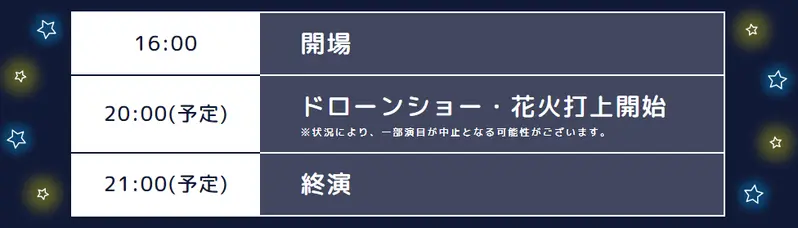 | 開催日時 | 2023年8月25日(金) 16:00 開場 20:00 ドローンショー・花火打上開始 21:00 終演 |