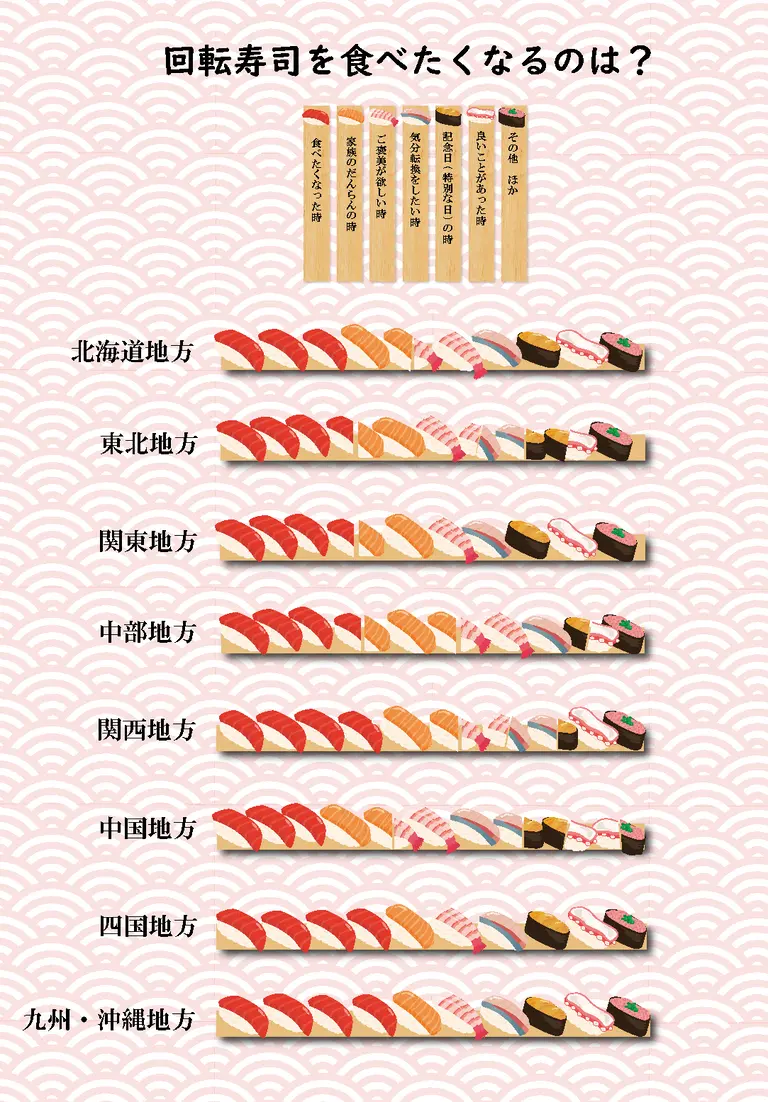 中国地方では「気分転換」や「記念日(特別な日)」に利用される傾向が他より高く、四国地方では「良いことがあった特」は回転寿司を利用する、など各地の特色が見られました。