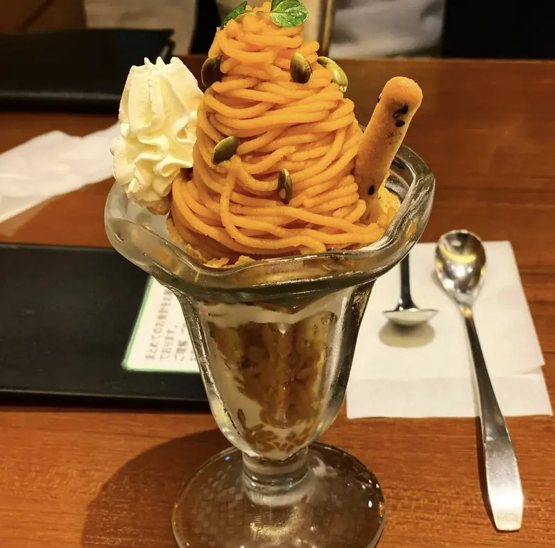 大人気なお店「よつ葉ホワイトコージ 札幌ステラプレイス店」で食べられるのが”北海道産かぼちゃとあずきの和風モンブランパフェ“です!