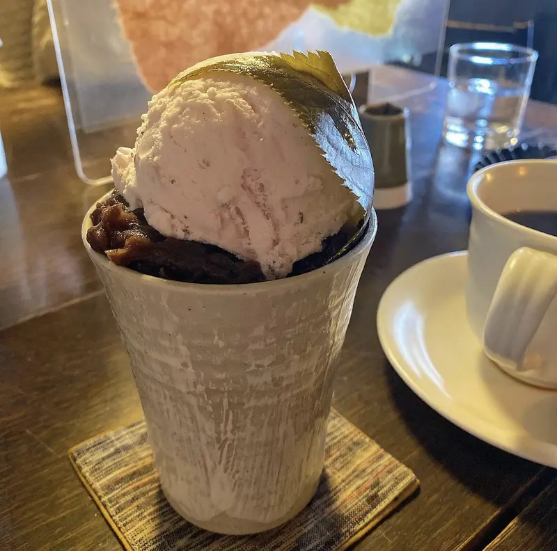写真は春限定の”桜の和風パフェ“ 濃厚な桜味のアイスクリームが桜の葉にまかれて桜餅のような見た目です!
