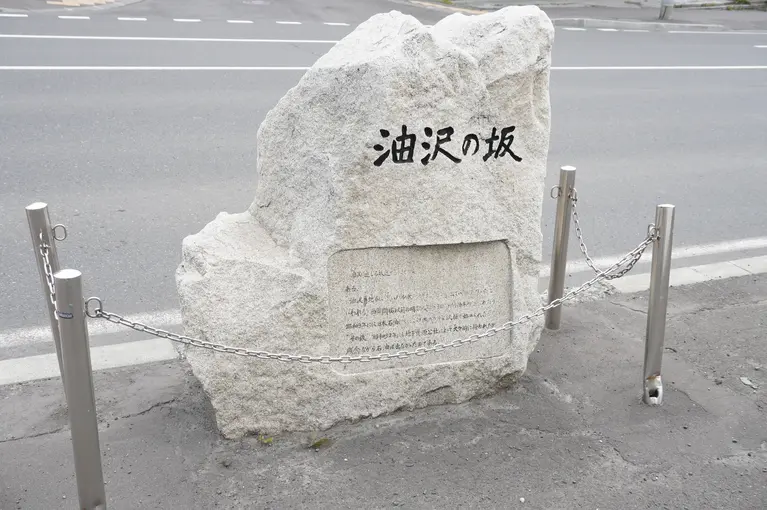 バス停「西岡3条13丁目」からは数百mの下り坂。その歩道には「油沢の坂」の石碑が建っています。