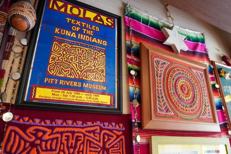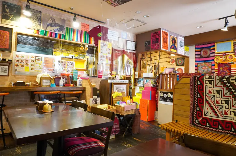 壁にはロックバンドのポスターや、オーナーの千田さんの奥さまが刺繍したパナマの民芸刺繍「モラ」が飾られておりエキゾチックな雰囲気。