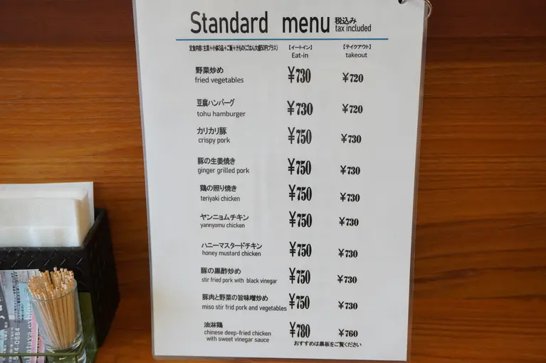 テーブルの上には「野菜炒め」730円や「豚の生姜焼き」750円など定番が書かれたメニュー表を用意。